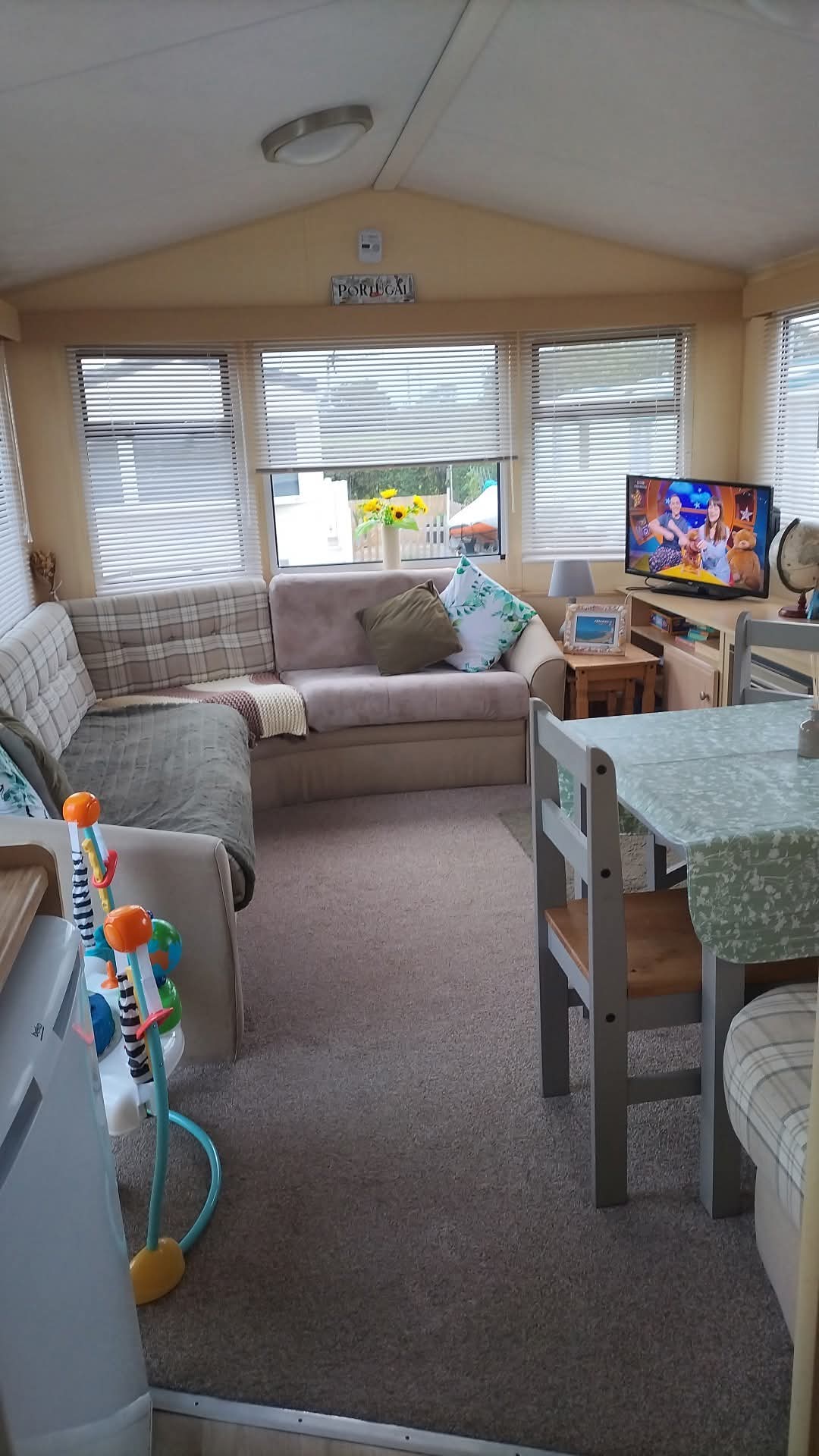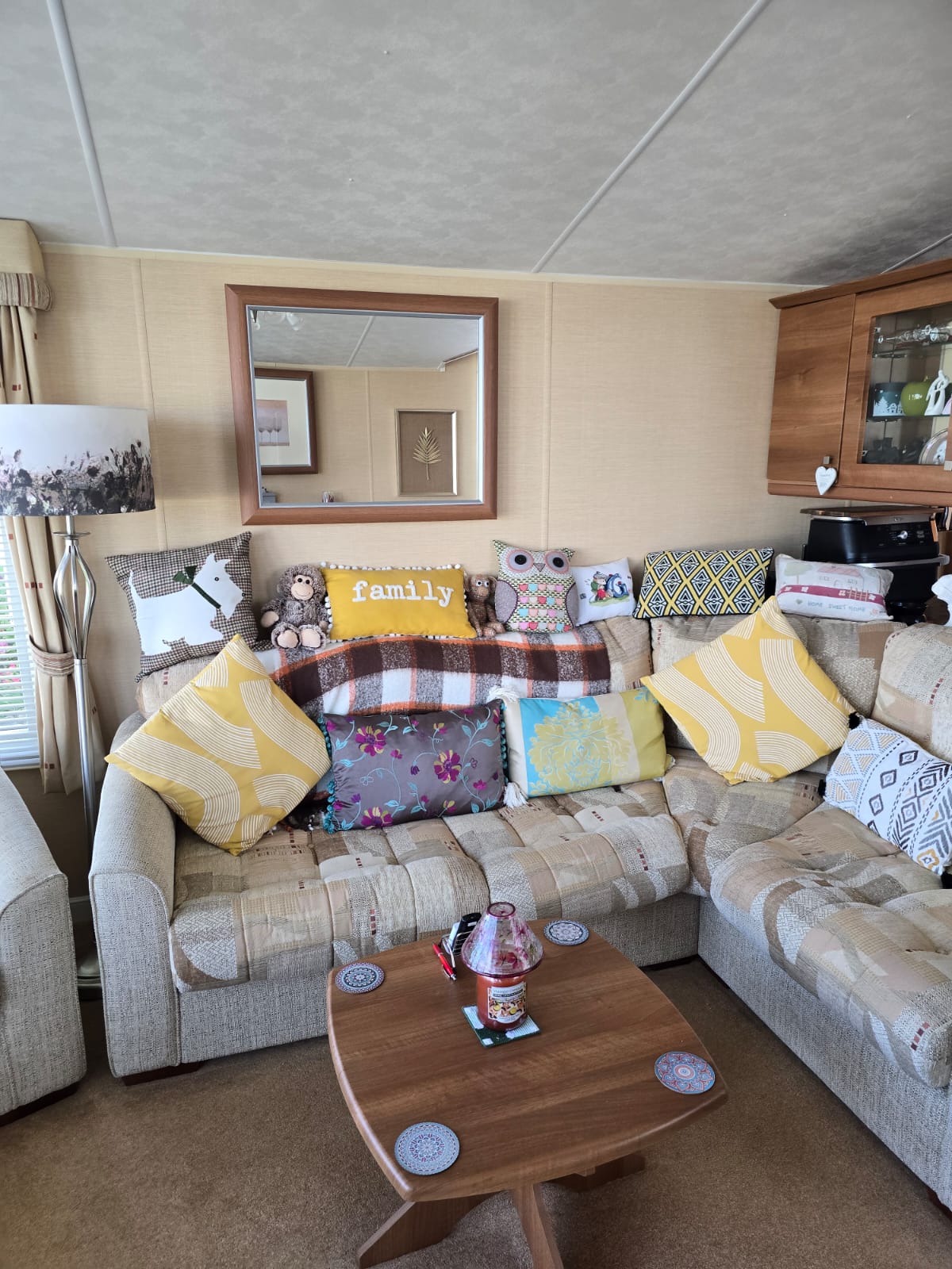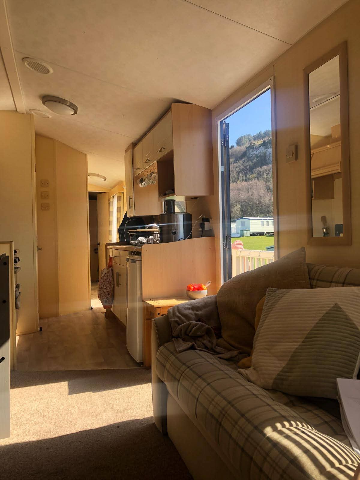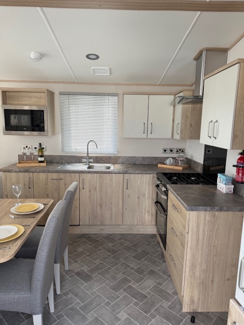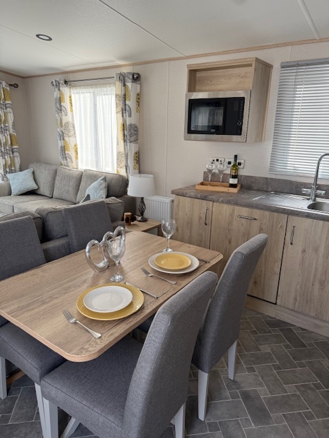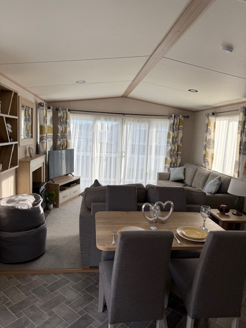 The lounge offers a bright open plan feel with large front windows, plush velvet stye sofas, an electric fire with stylish surround and coffee table, creating a warm homely atmosphere. There are also newly installed venetian blinds throughout and thick luxury curtains. This caravan is double glazed and central heated for the cooler months.
