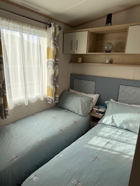 The twin bedroom has 2 single beds, under bed storage and overhead storage, bedside table and a wardrobe.