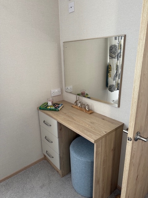 The inviting bedroom is designed for both comfort and functionality. The double bed, with the addition of your favourite bedding, promises a great night’s sleep. Above the bed, handy shelves offer space for books, plants, or treasured keepsakes, adding a personal touch. The wardrobe provides ample storage for your clothing, while the built-in dressing table with a stool is perfect for getting ready in the morning.