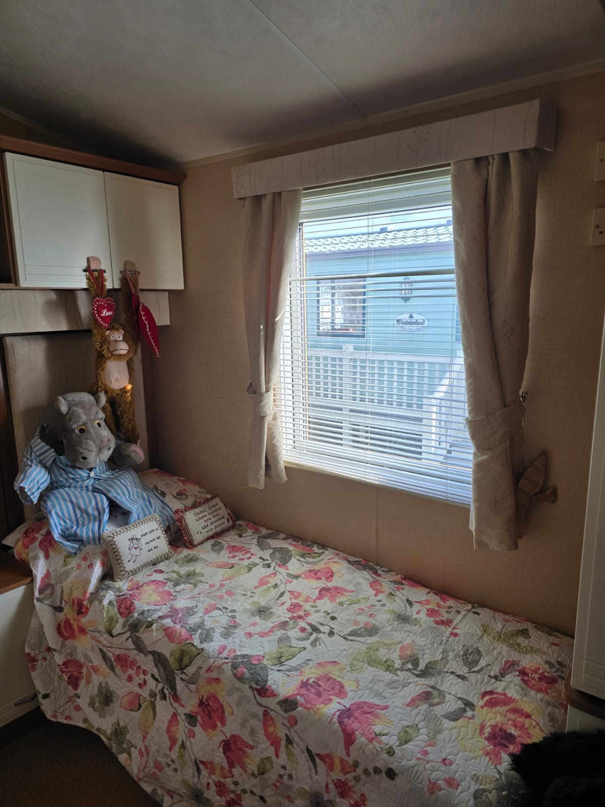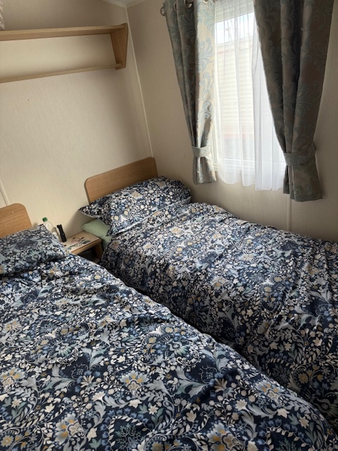 The twin bedroom has a TV bracket already installed, storage space under the beds and pretty statement curtains.