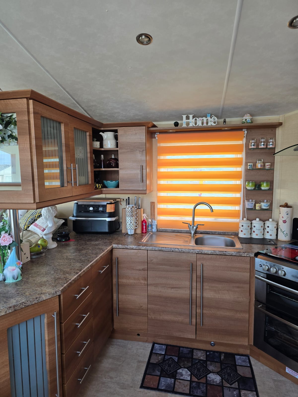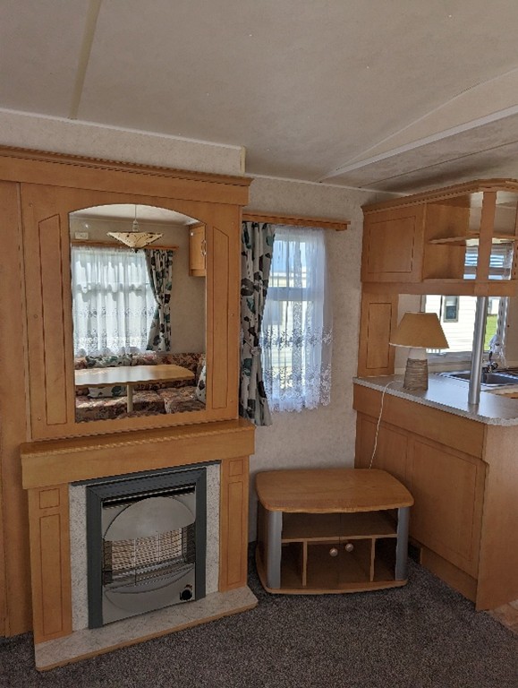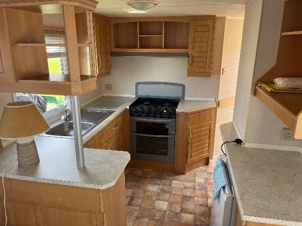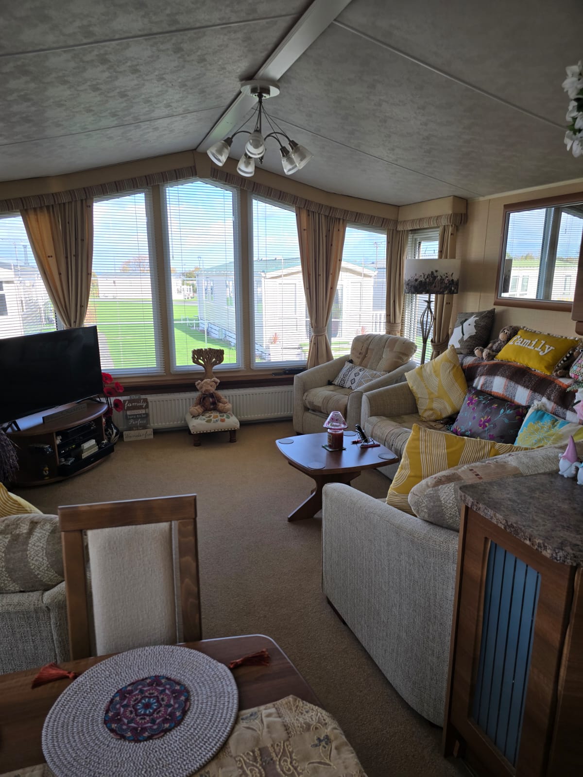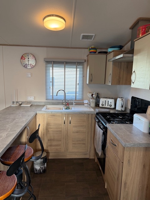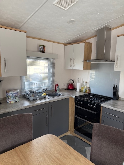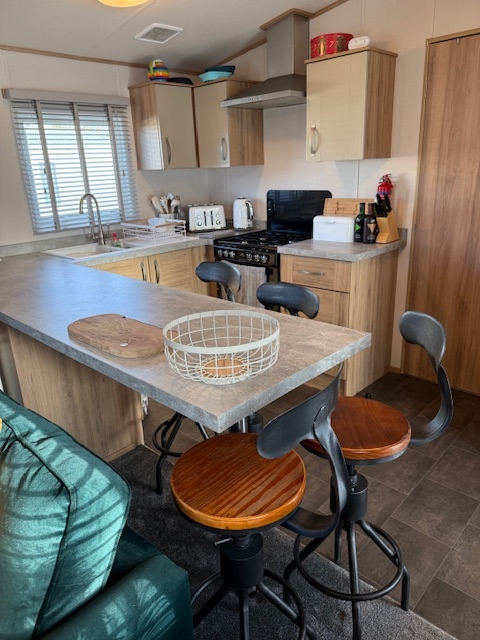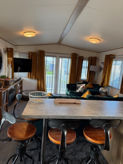 The lounge offers a bright open plan feel with large front windows, plush velvet stye sofas, an electric fire with stylish surround and coffee table, creating a warm homely atmosphere. There are also newly installed venetian blinds throughout and thick luxury curtains. This caravan is double glazed and central heated for the cooler months.