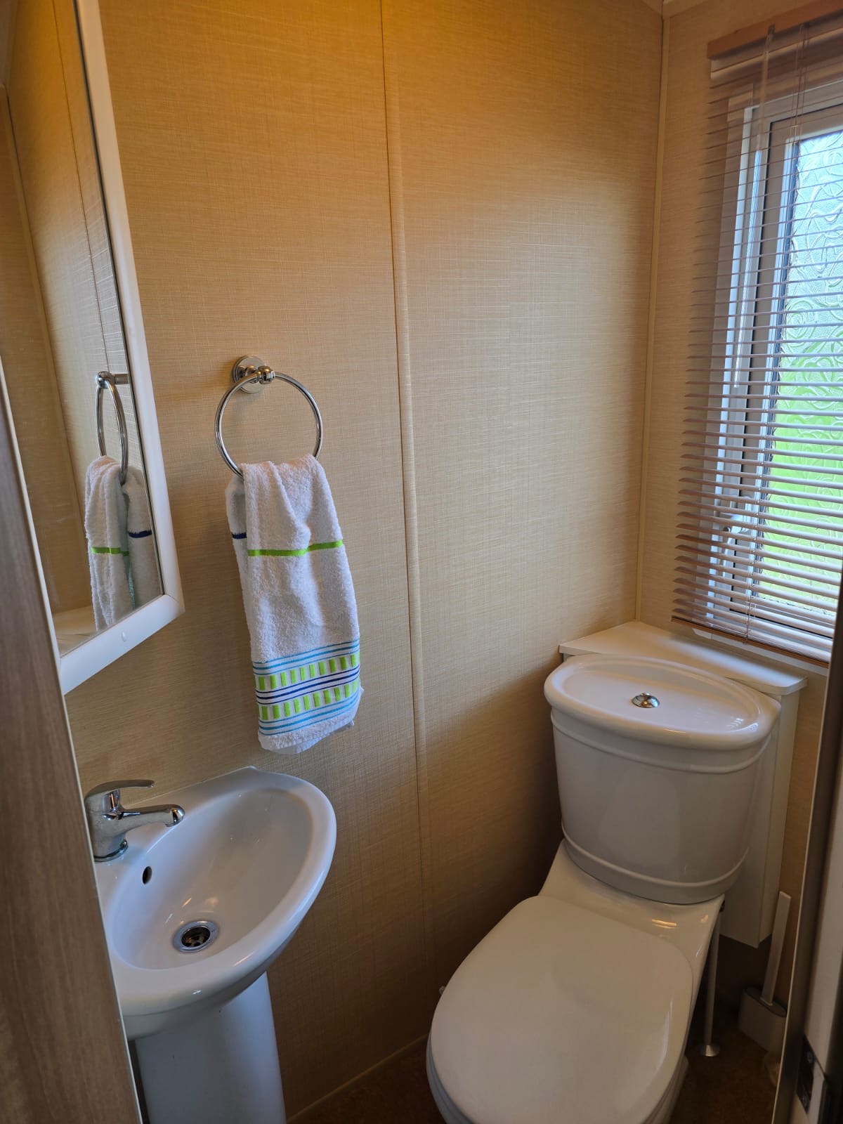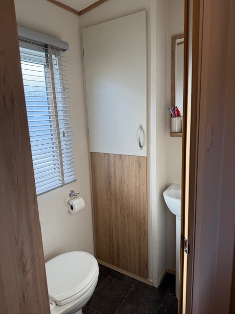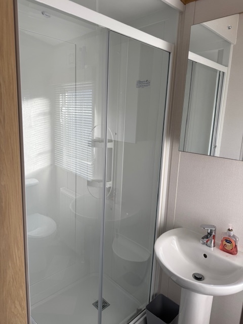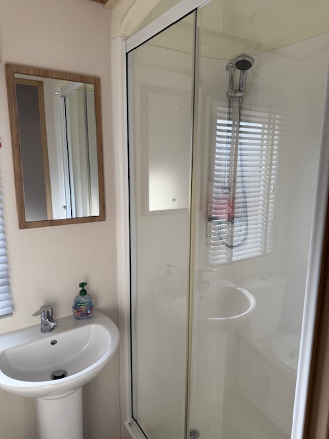 The bathroom is clean, modern, and well‑appointed, featuring a full‑size shower, sink with a vanity unit. There’s good storage for toiletries and everyday essentials, making it a practical and pleasant space for holiday living.