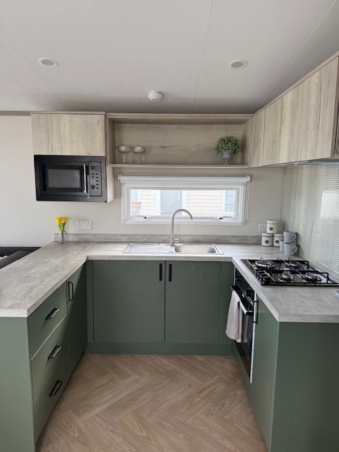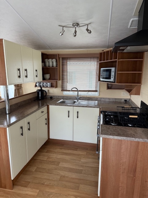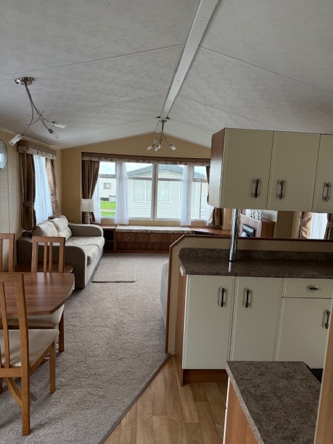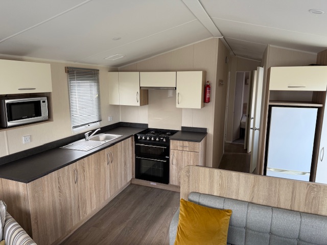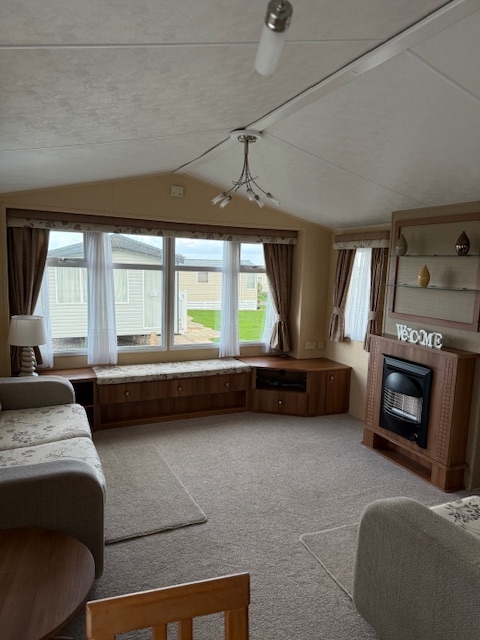 The lounge offers an open plan living space with standalone sofas, Window seat, ample storage, a gas fire for cosy evenings and TV Unit with a TV included. This caravan is also double glazed and is central heated for the cooler months.