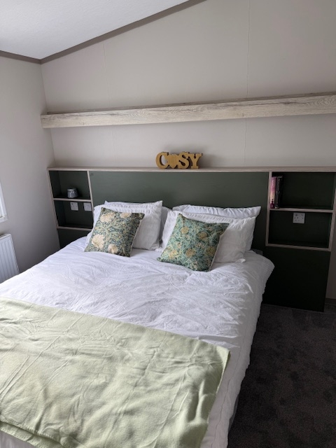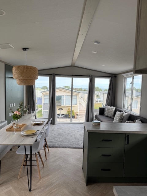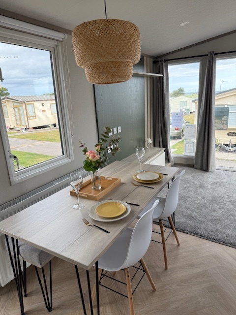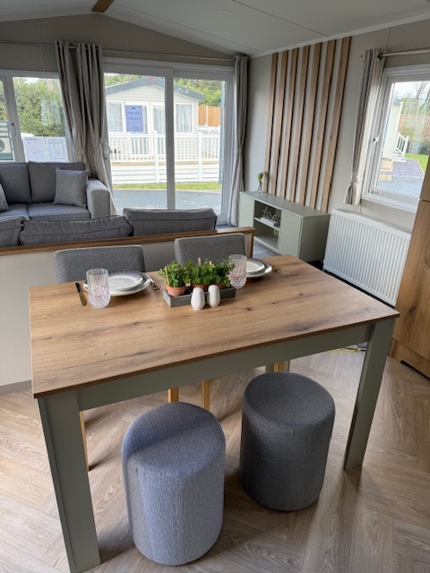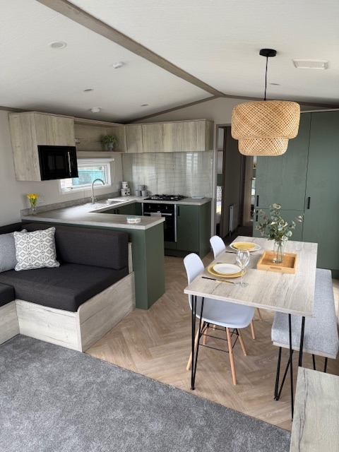 The lounge offers a peaceful escape from the everyday with full height windows to bask in the sunshine all year round. The large L-shaped sofa is perfect for family movie nights and guests can get comfy and stay the night. There’s plenty of storage for toys, holiday essentials, and home comforts so you can pack your favourite things. For colder months you can are able to enjoy the electric fire so you can enjoy your holiday home, whatever the weather.