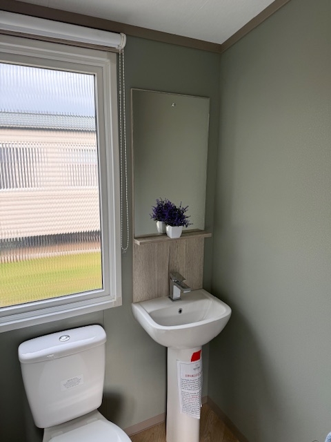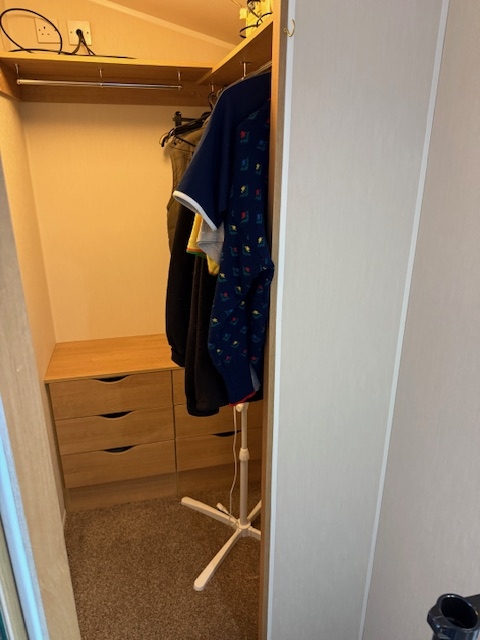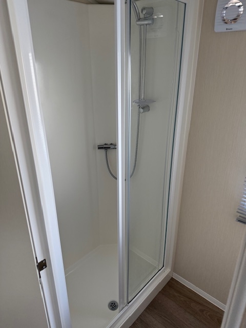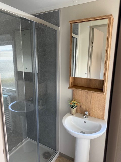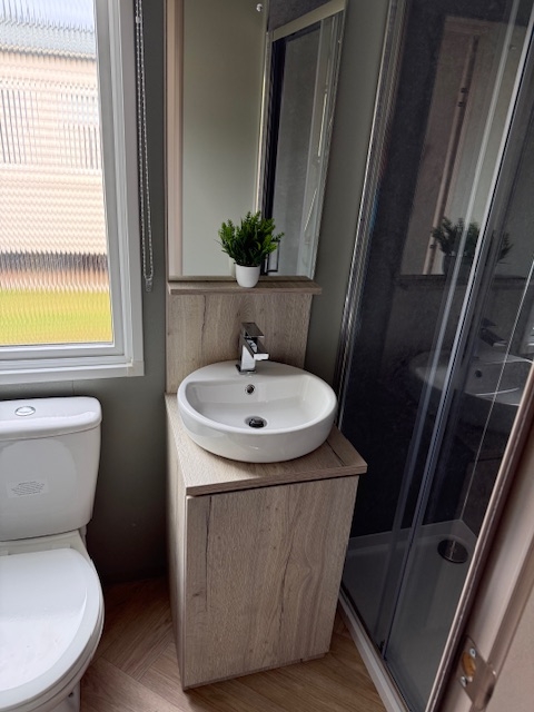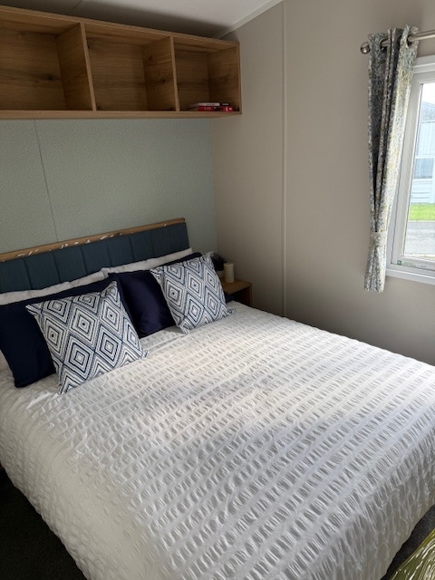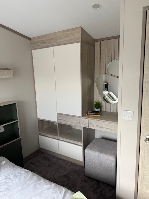 The inviting bedroom is designed for both comfort and functionality. The double bed, with the addition of your favourite bedding, promises a great night’s sleep. Above the bed, handy shelves offer space for books, plants, or treasured keepsakes, adding a personal touch. The wardrobe provides ample storage for your clothing, while the built-in dressing table with a stool is perfect for getting ready in the morning.