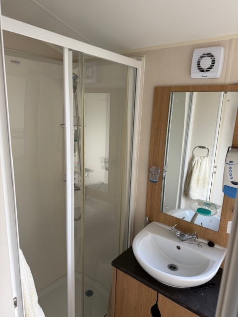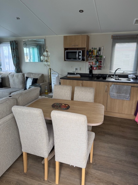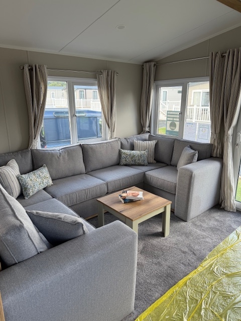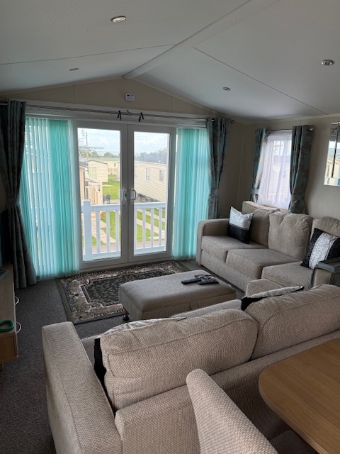 The lounge offers an open plan light filled living space with standalone sofas, pouffe style coffee table and TV Unit including the TV. This caravan is also double glazed and is central heated for the cooler months.