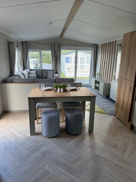 The Debonair fuses country living with modern fixtures and fittings. The sofas are free standing, as is the dining room table. The fridge and freezer are integrated and there is plenty of storage space.