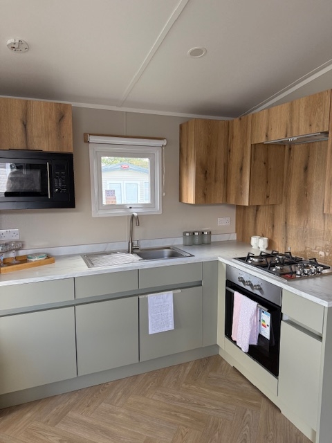 The kitchen has a lovely modern feel with wood and cream kitchen doors, there is ample storage with gas hob, extractor fan, gas oven, and microwave plus storage cupboard. There is also a breakfast bar with wooden stool seating for entertaining.