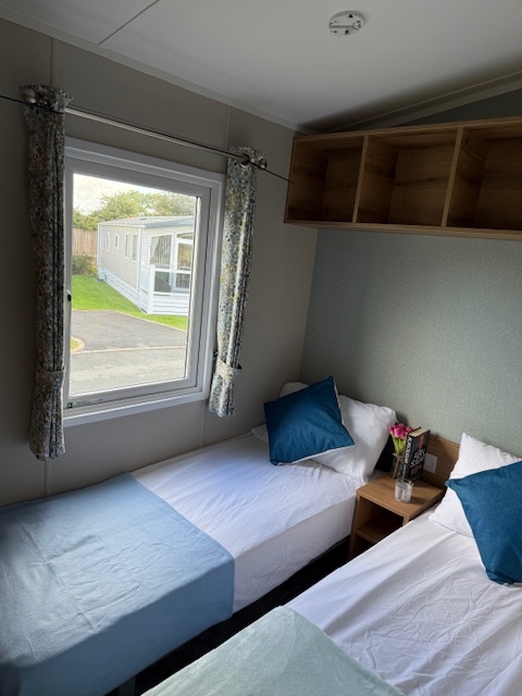 The twin bedroom has 2 single beds, under bed storage and overhead storage, bedside table and a wardrobe.