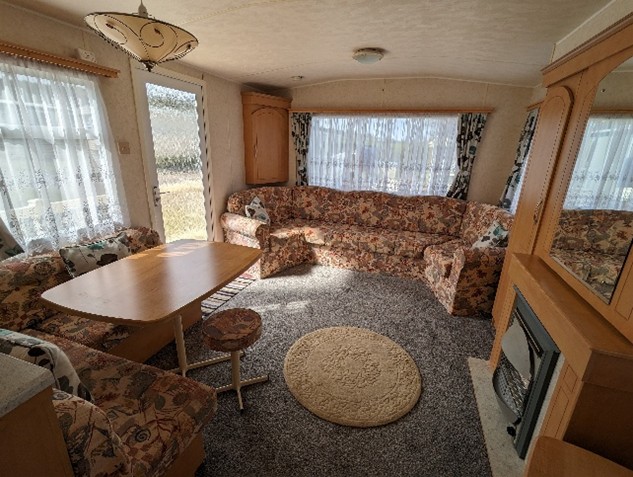 The lounge offers two deep, plush sofas, a traditional mantelpiece with a flame-effect electric fire, and a freestanding TV unit creating a cozy, inviting lounge. There is also newly installed blinds throughout. This caravan is double glazed, central heated and double insulated for the cooler months.