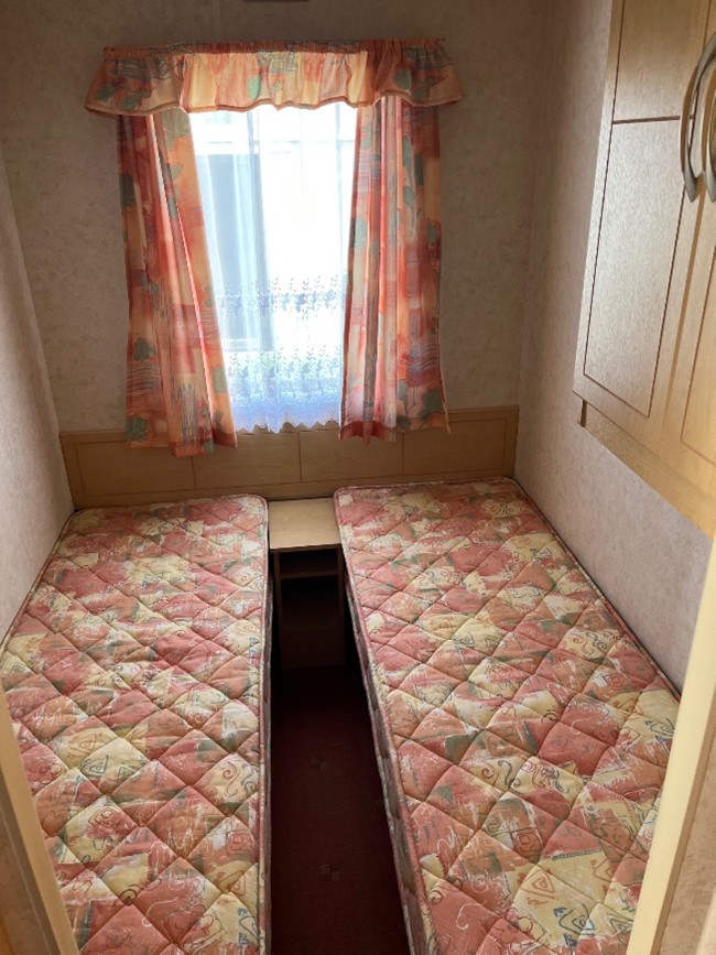 The twin bedroom is perfect for guests or children, offering two comfortable single beds and practical storage options including a wardrobe and shelving.